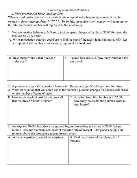 Linear Equations Word Problems Worksheets with Answer Key